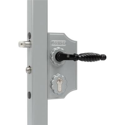 Komplet zámkové krabice, zámku, zdobené kliky a cylindrické vložky pro křídlové branky s šířkou jeklu 30 až 40 mm. Lze použít pro levé i pravé otevírání.