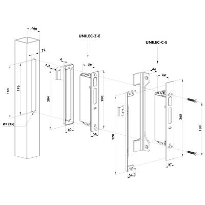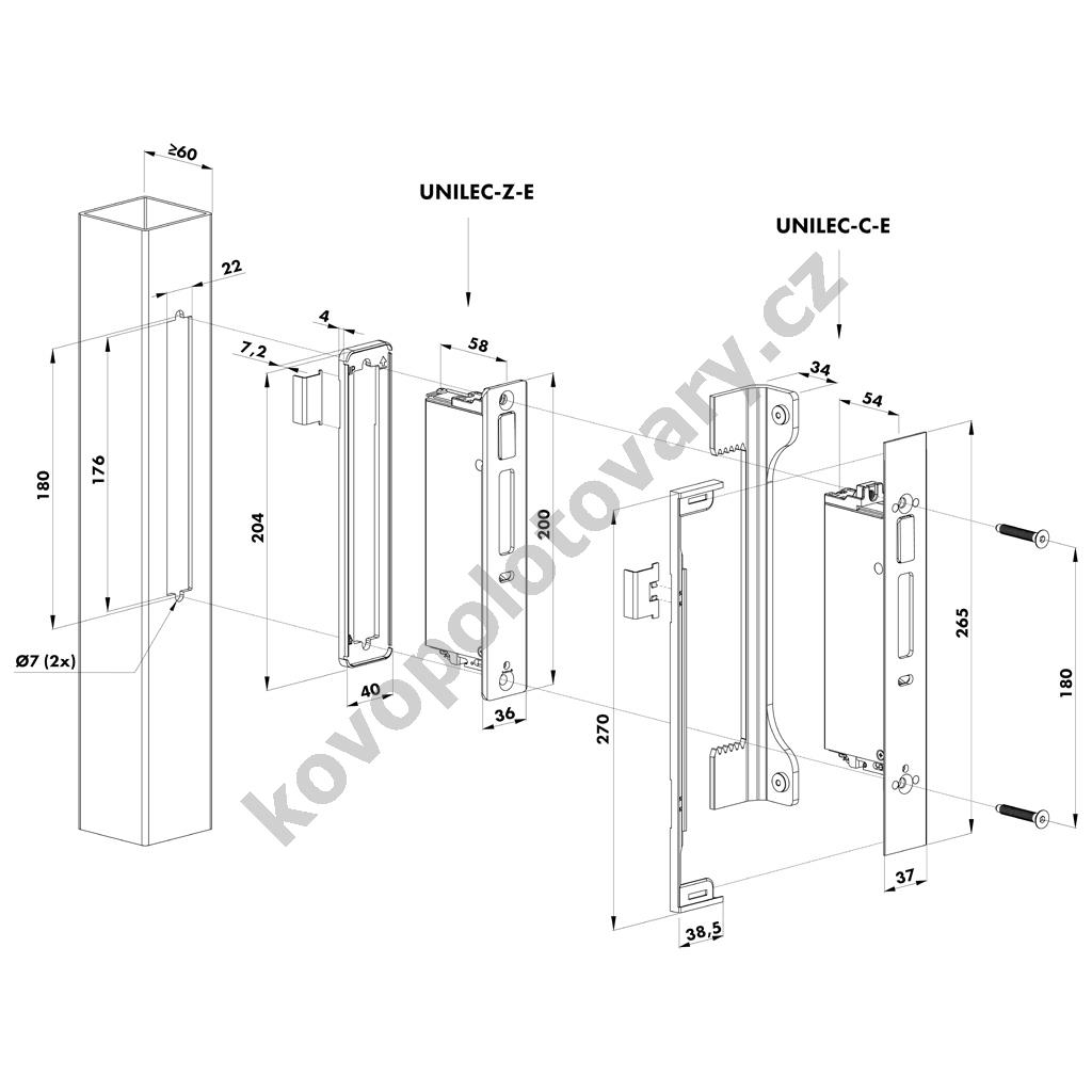LOCINOX UNILEC-Z-E (P00038776) Elektrický otvírač s distančním rámečkem bez dorazu pro zadlabací zámky LOCINOX FORTYLOCK, FIFTYLOCK, SIXTYLOCK a EIGHTYLOCK, určen pro křídlové branky s profilem od 60 mm. Lišta je vybavena elektrickým zapadacím mechanismem, který vysouvá střelku zámku směrem ven. Tento otvírač zajišťuje minimální mezeru mezi sloupkem a křídlem brány.