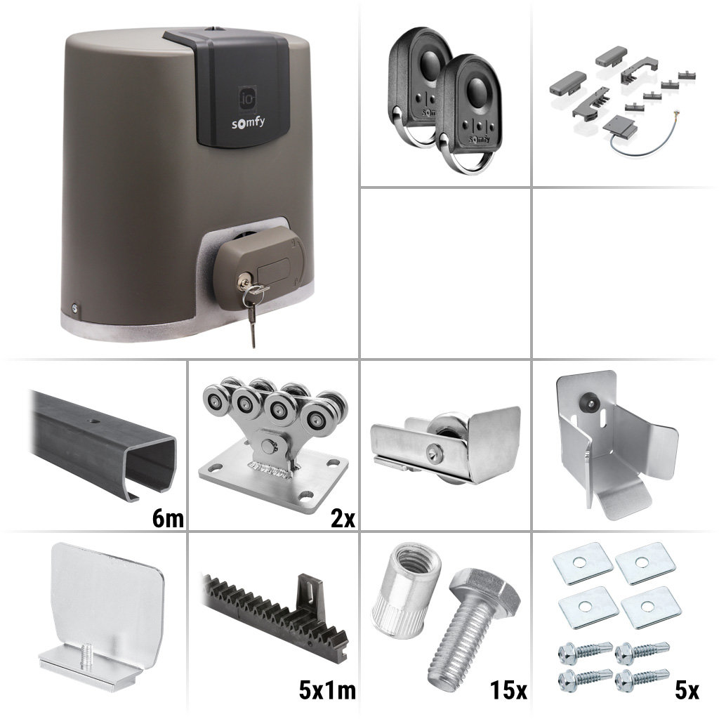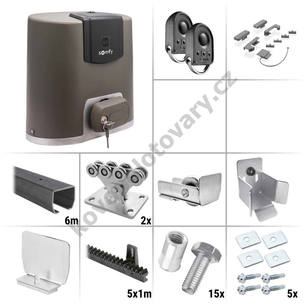 Somfy Elixo 500 3S M io Standard 7.0 Sestava pojezdových komponent, pohonu a příslušenství pro výrobu pojezdu a automatizaci posuvné samonosné (nesené) brány do 4,2 m průjezdní šířky a celkové hmotnosti do 425 kg. Při dokoupení dalšího C profilu lze tuto sadu použít až do 4,5 m šířky průjezdu a 450 kg.