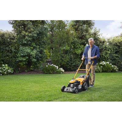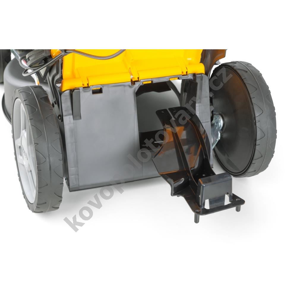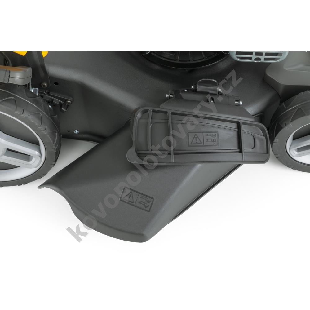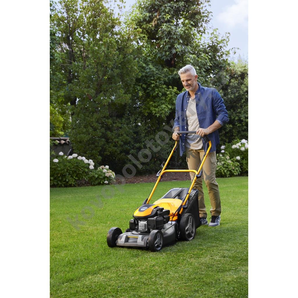 3, který poskytuje stabilní výkon 2,2 kW. Vlastní pojezd s pohonem zadních kol výrazně usnadňuje práci ve svažitém terénu nebo při sečení rozlehlých ploch, přičemž konstantní rychlost 3,7 km/h je optimalizována pro pohodlnou chůzi.