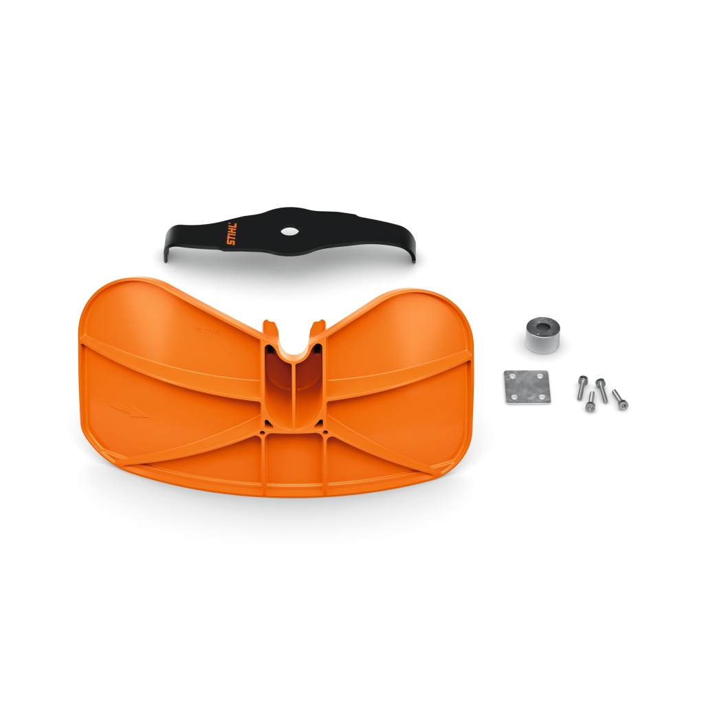 Sada štěpkovacího nože, ochranného krytu a montážních dílů pro křovinořezy STIHL. Umožňuje efektivní štěpkování a odstraňování plevele či hustých křovin. Zajišťuje bezpečnou a pohodlnou práci při údržbě rozsáhlejších ploch.